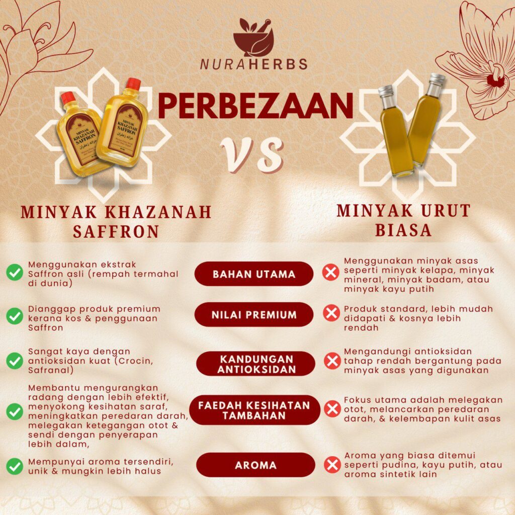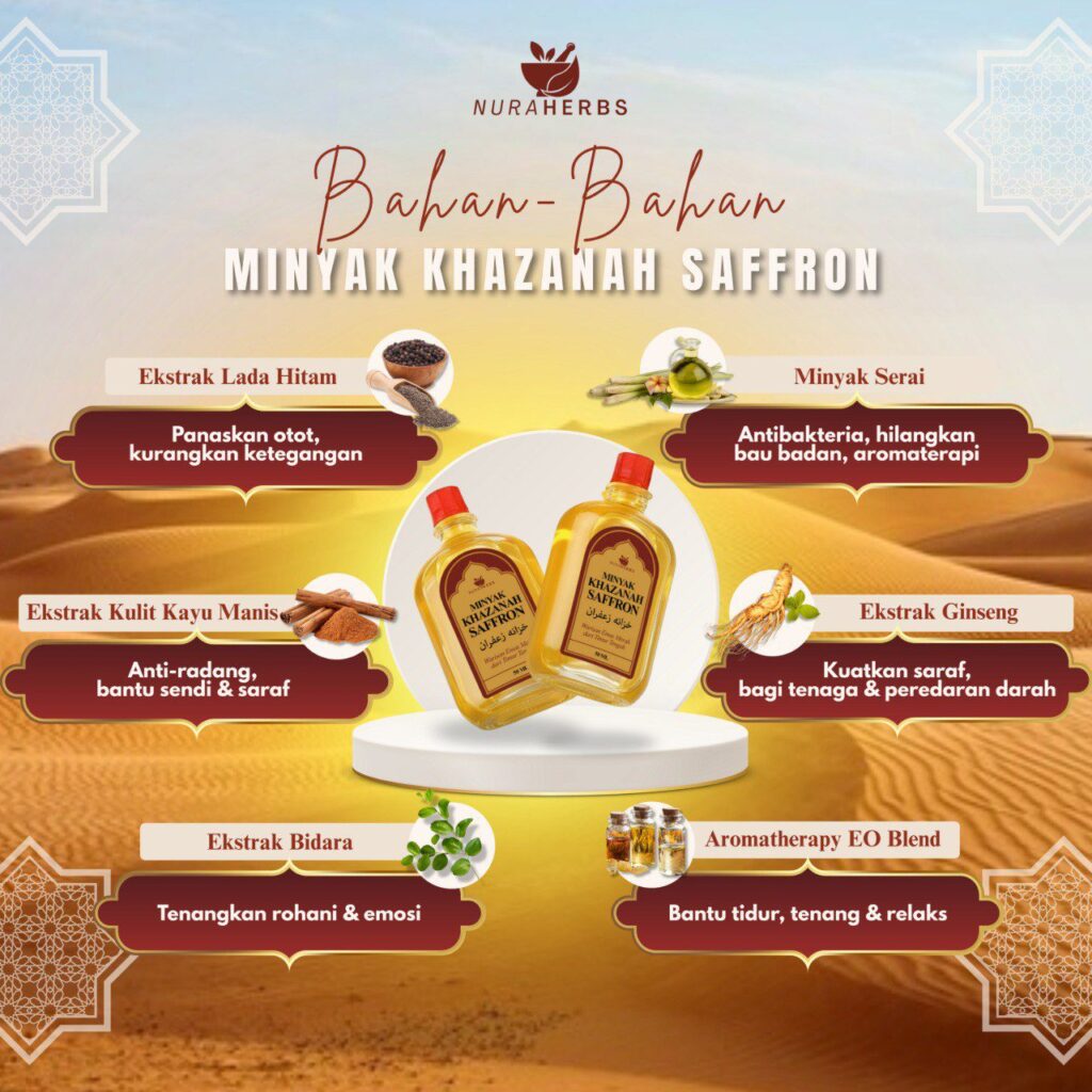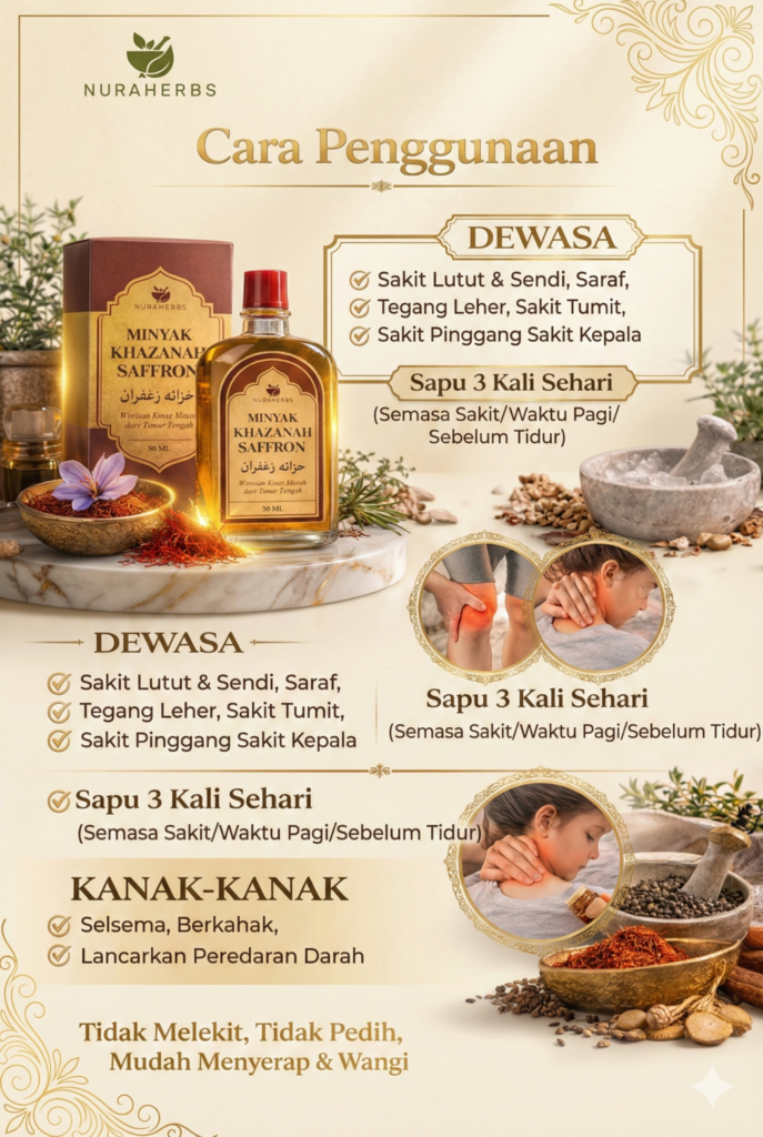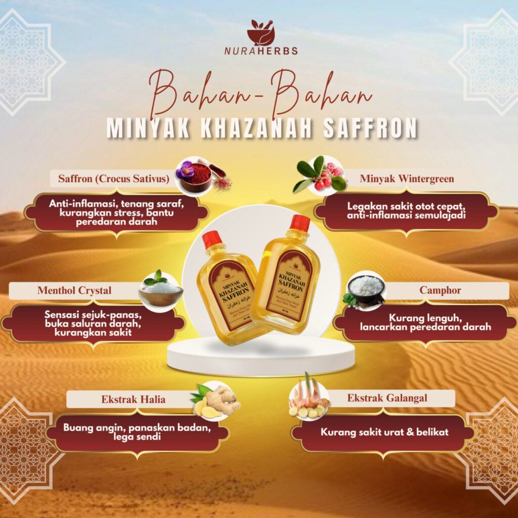 Ini bukan minyak urut biasa yang anda jumpa di pasar malam. Ini adalah Minyak Urut Aromaterapi Premium yang dirumus khas dengan Saffron tulen (ya, nampak helai saffron dalam botol!).